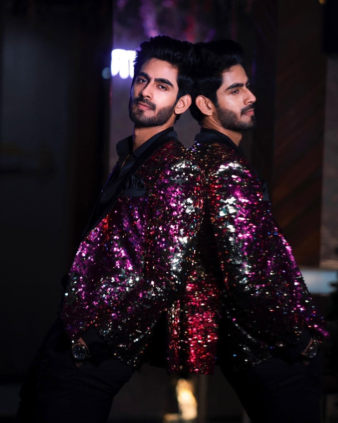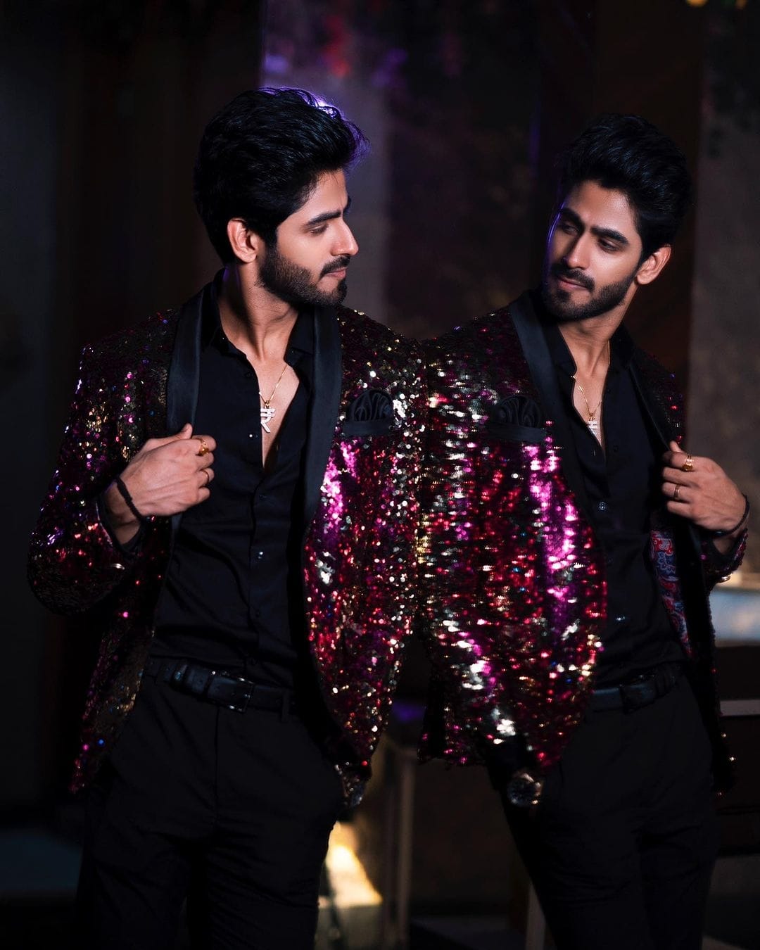 Black Sequins Blazer with deep magenta and violet tones by Bhanu Designer is made to shine under the lights. Perfect for receptions, sangeet nights, & parties.