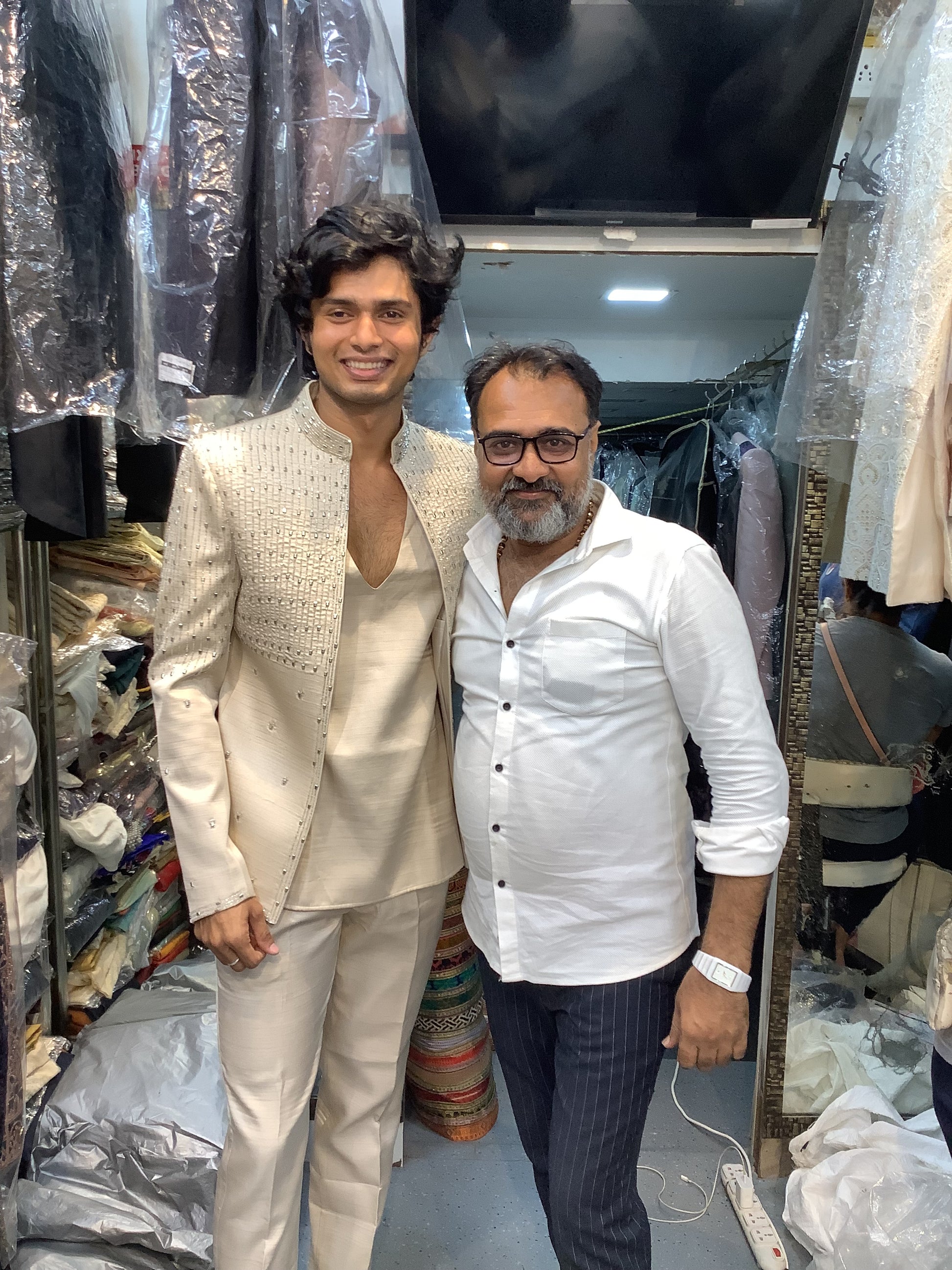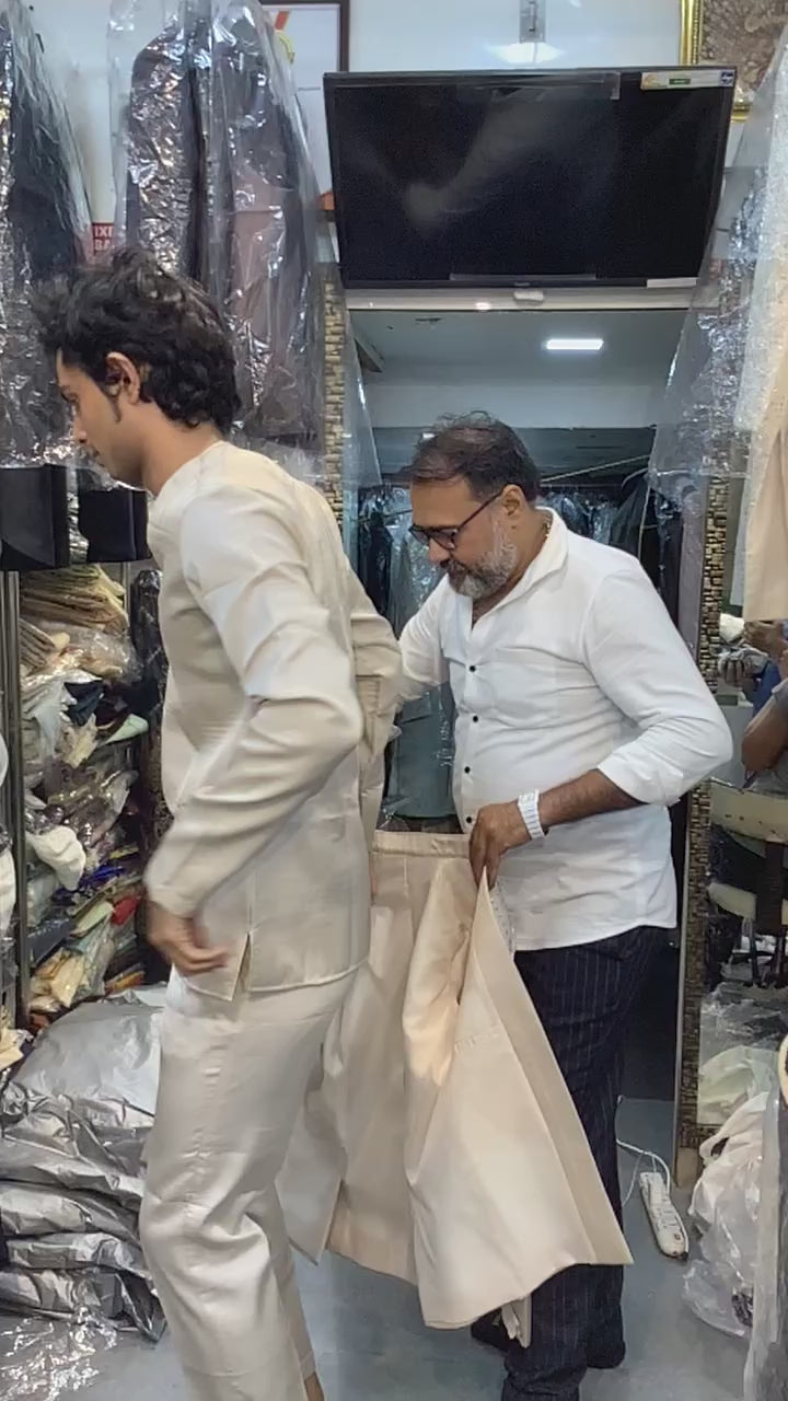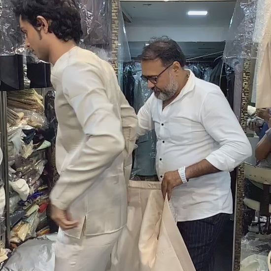 Ivory Jodhpuri set with handwork, paired with matching kurta and pants. Ideal for weddings, sangeet, or reception wear. Designed by Bhanu Designer.