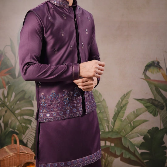 Premium plum kurta set with detailed embroidery on the collar, hem, and front. Paired with matching straight pants. Ideal for sangeet, engagement, festive events, and weddings.